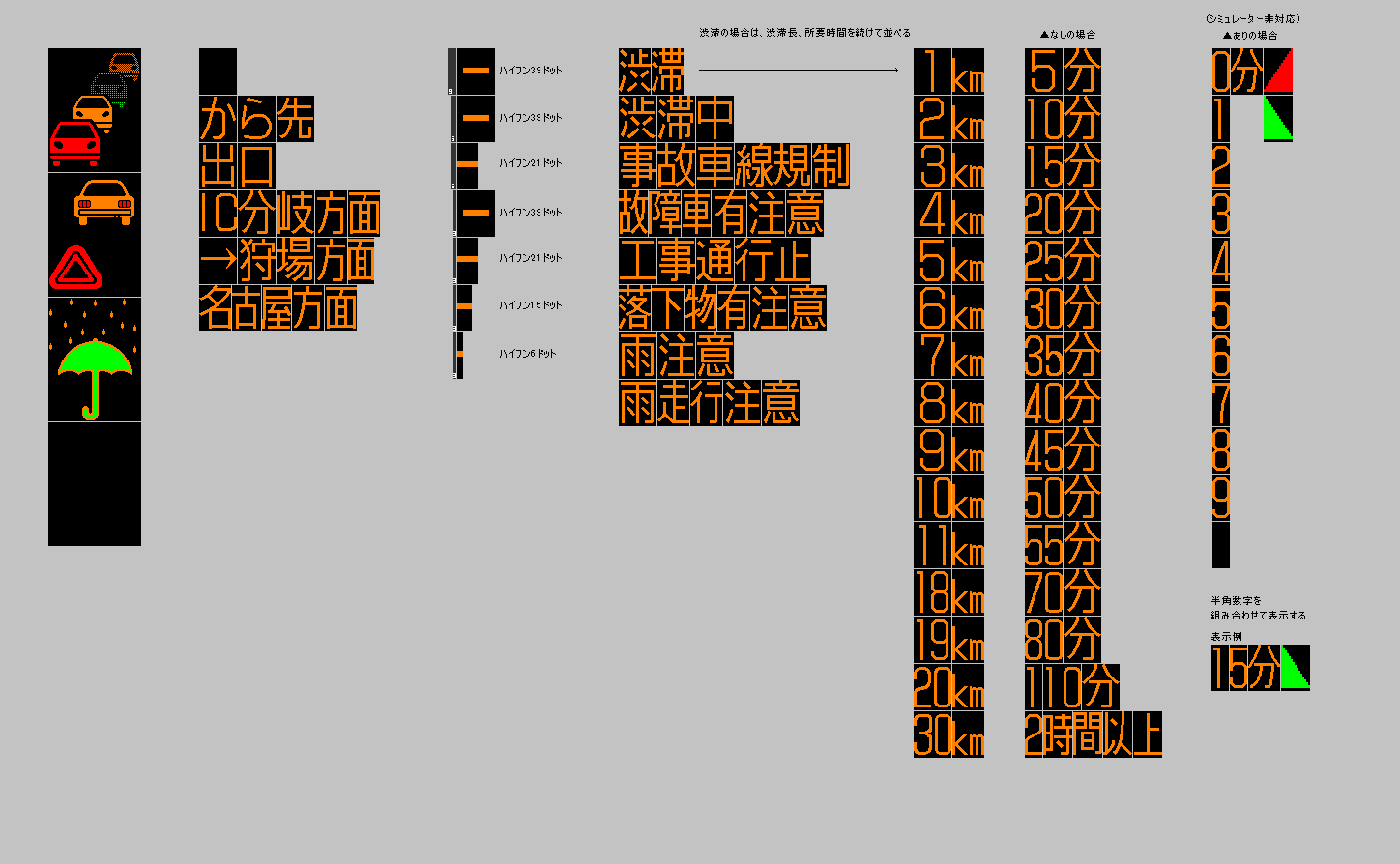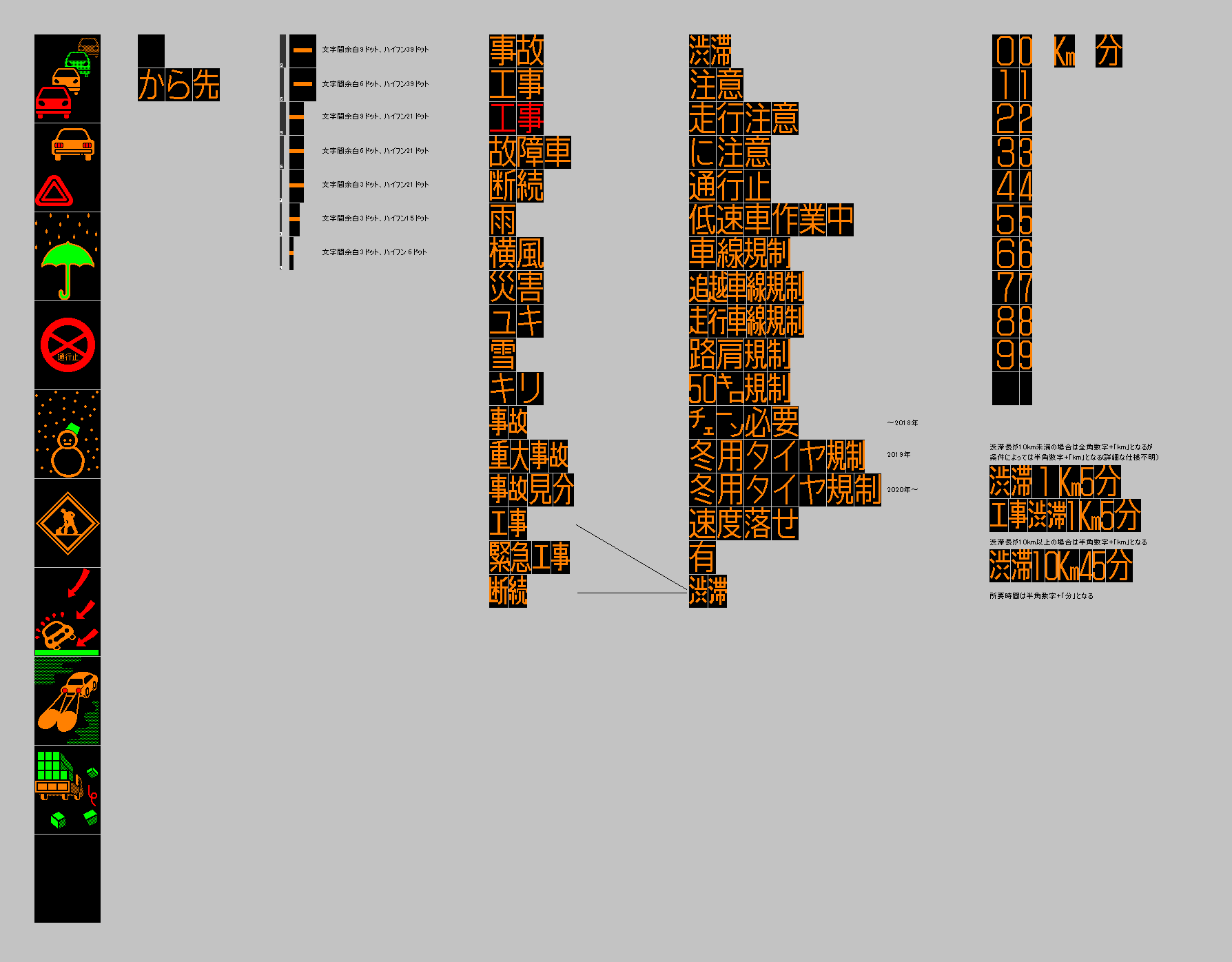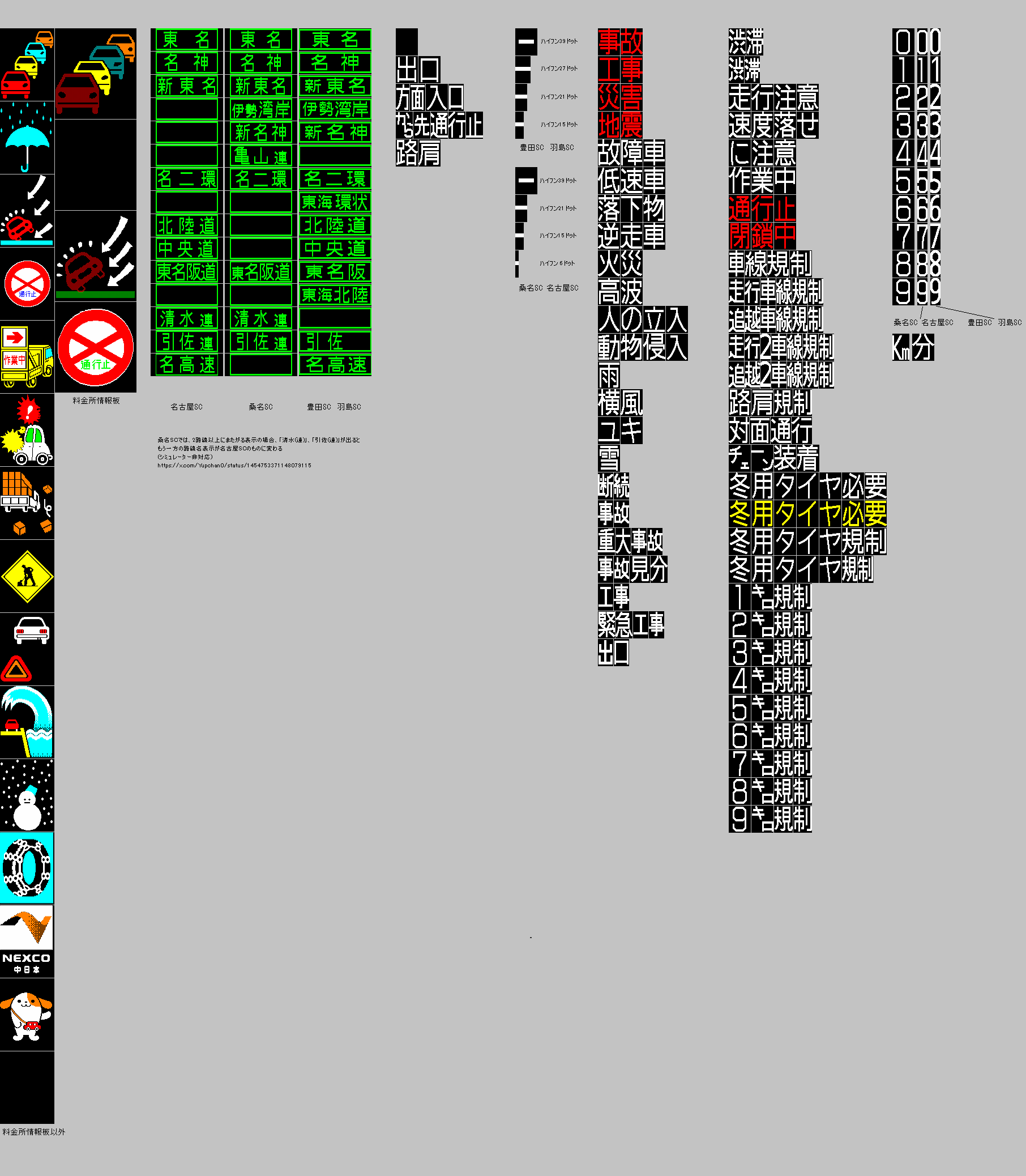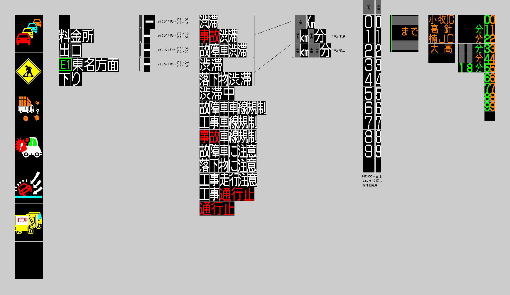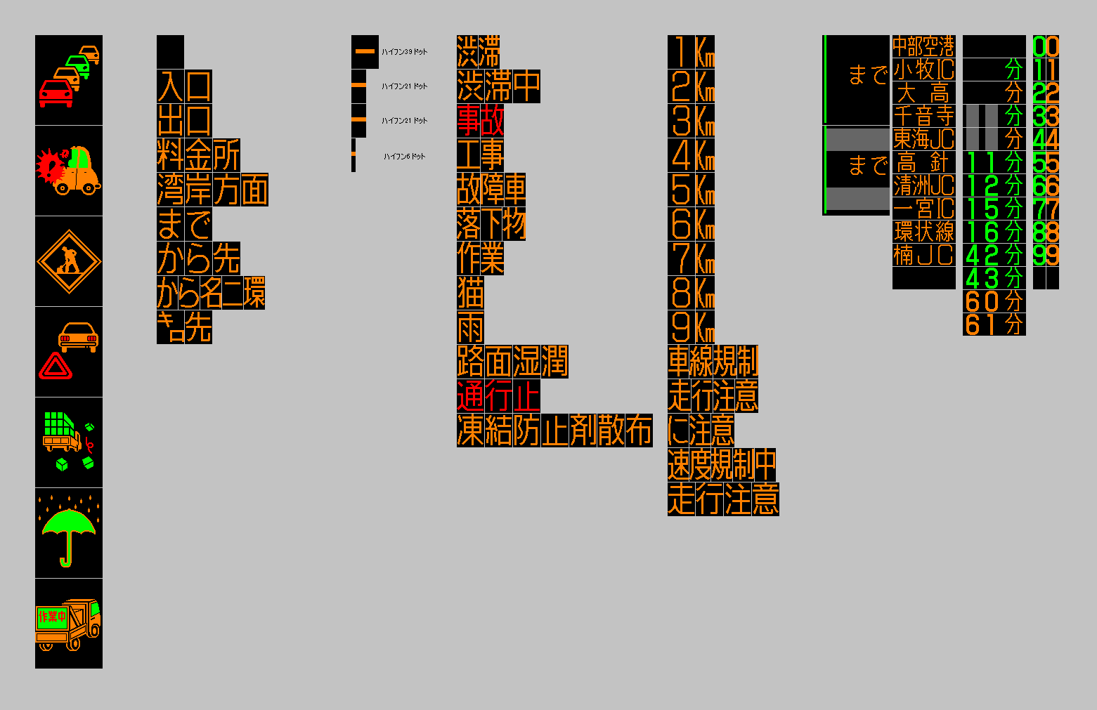 フリー入力で表示される文字は、NEXCO西日本関西支社や阪神高速3色で集めたものを元にして、フルカラー用の表示は一括変換で作成しています。