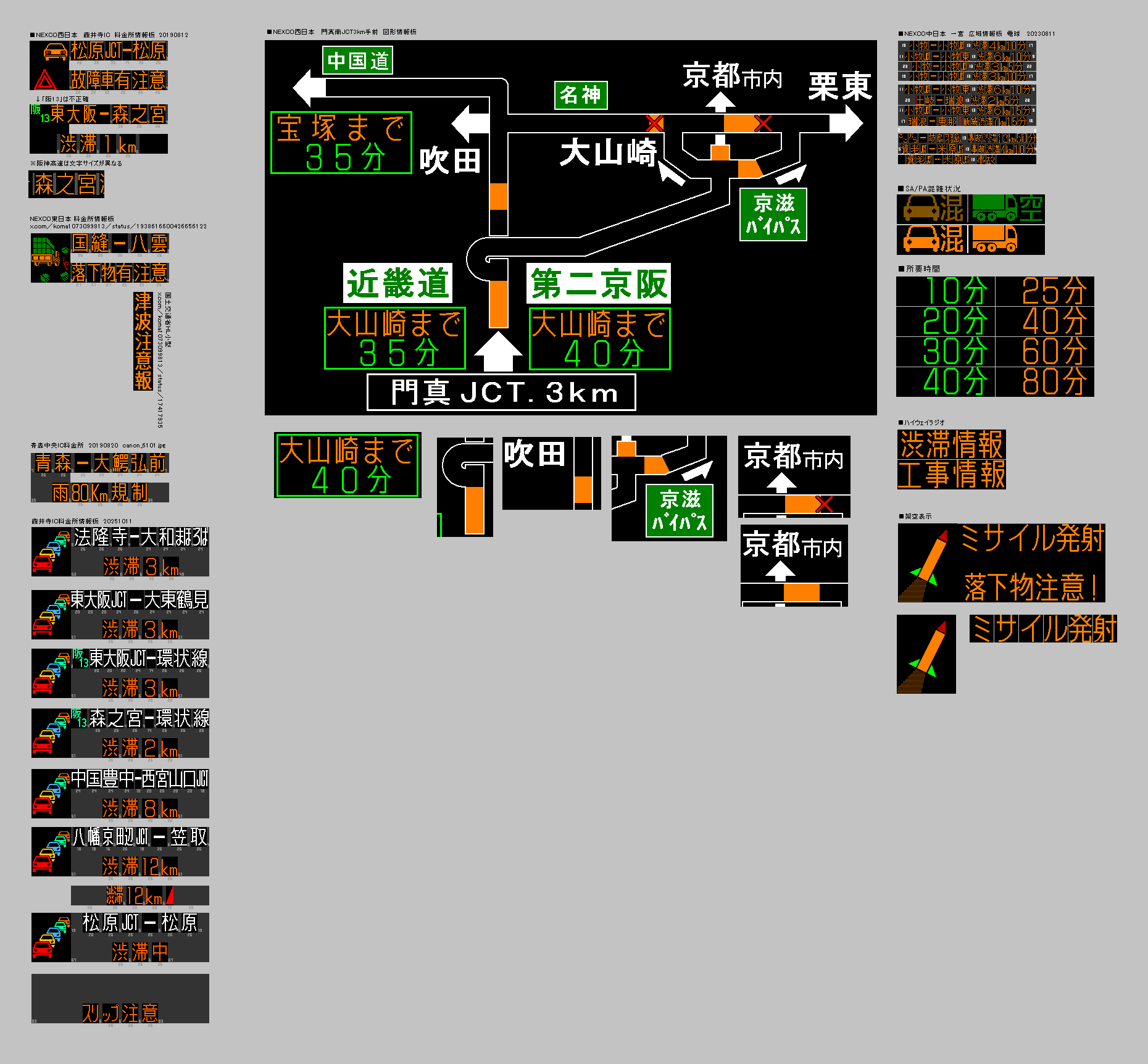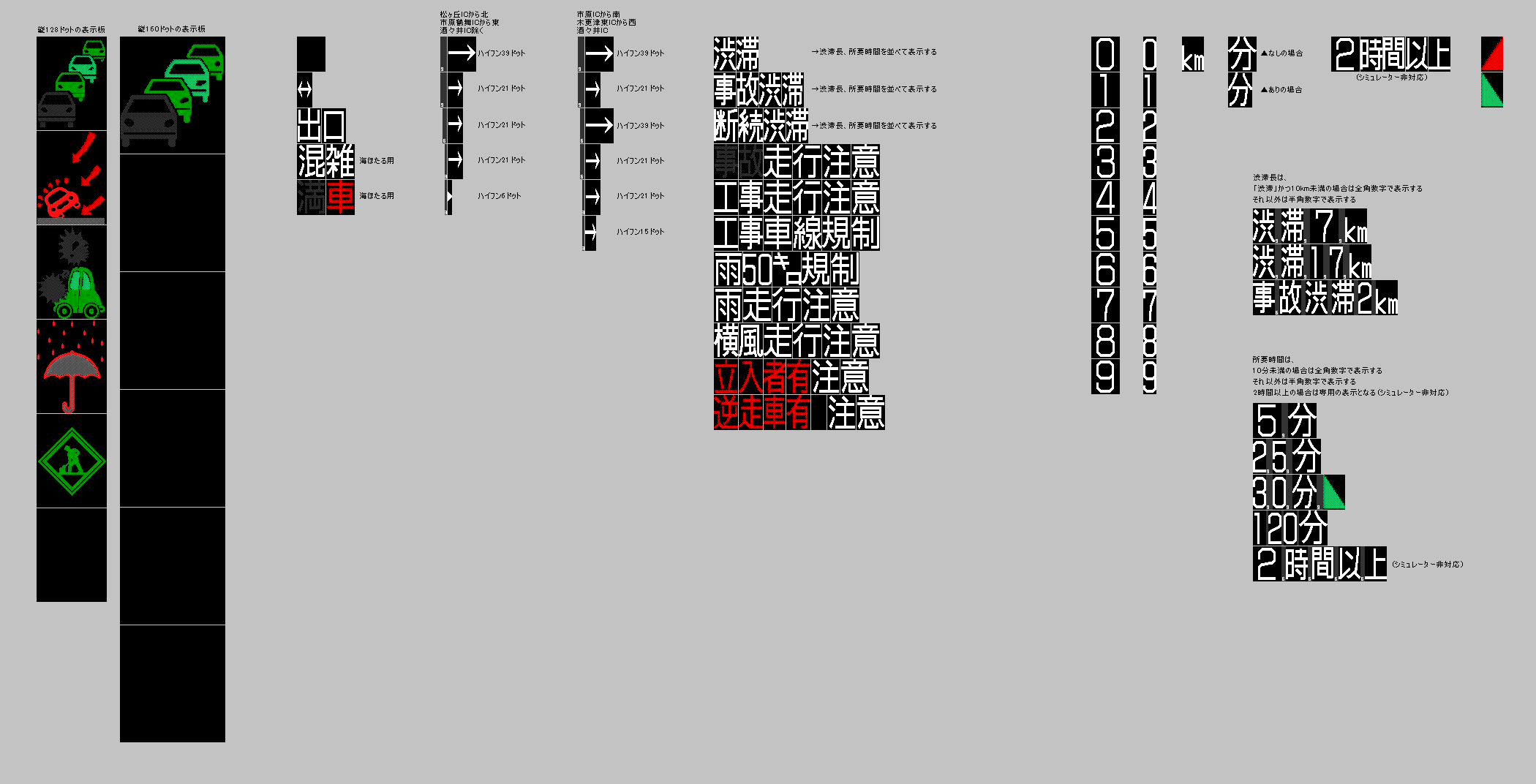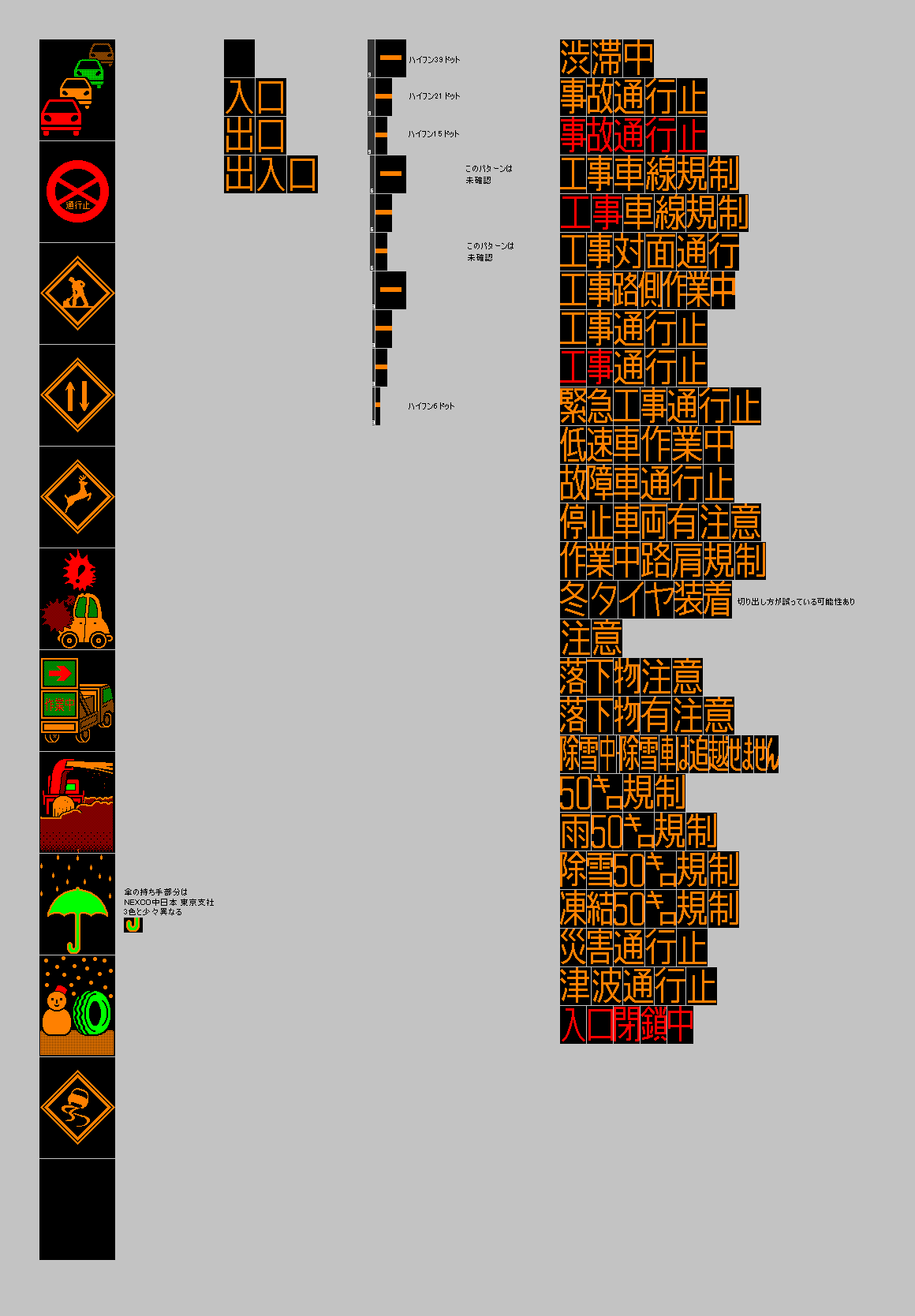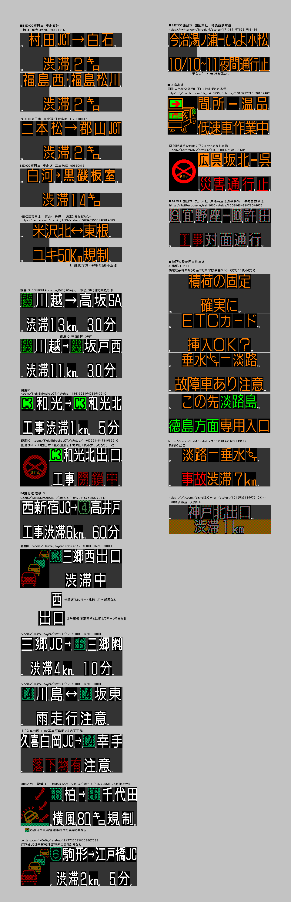 フリー入力で表示される文字は、NEXCO西日本関西支社や阪神高速3色で集めたものを元にして、フルカラー用の表示は一括変換で作成しています。