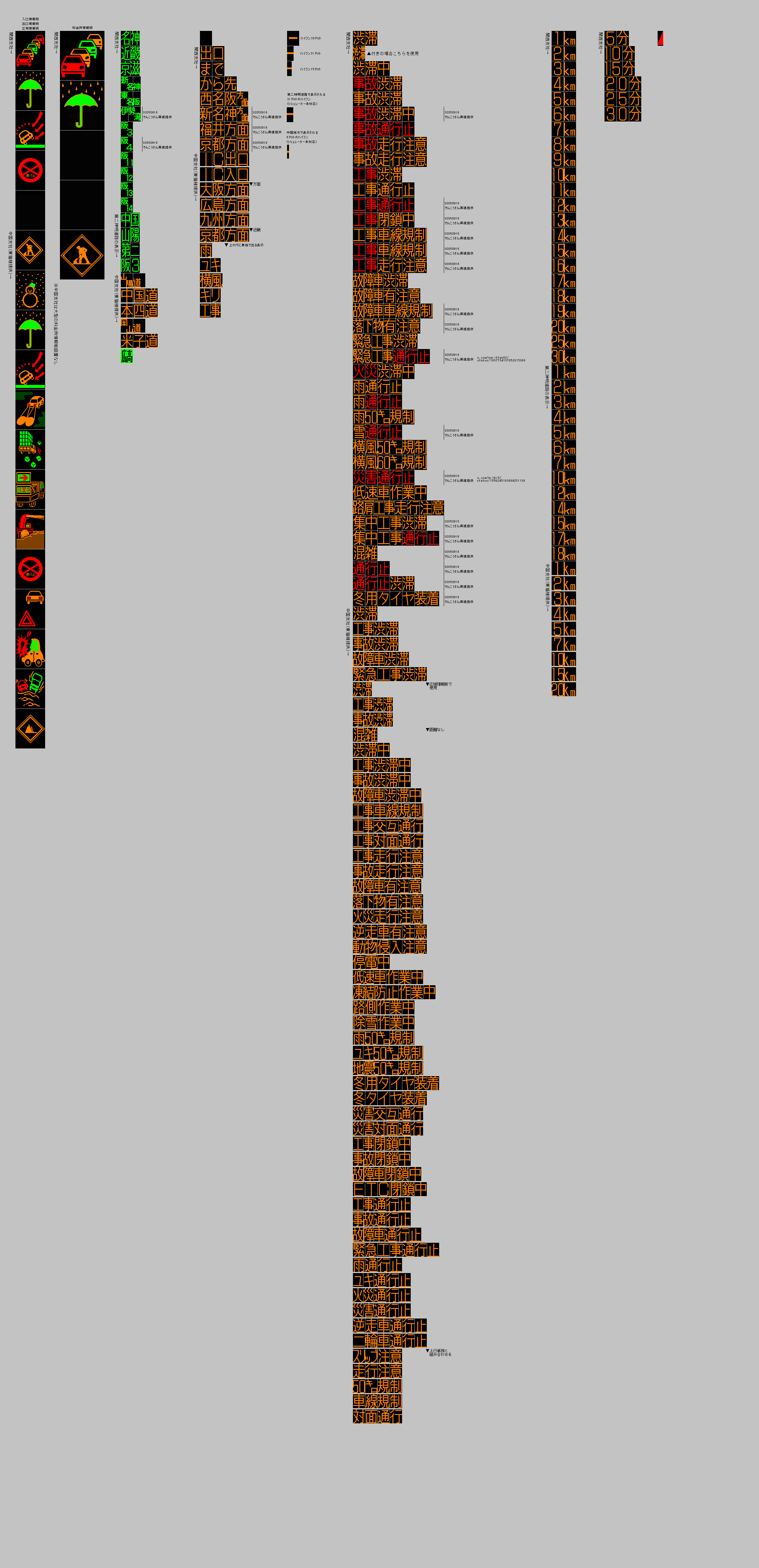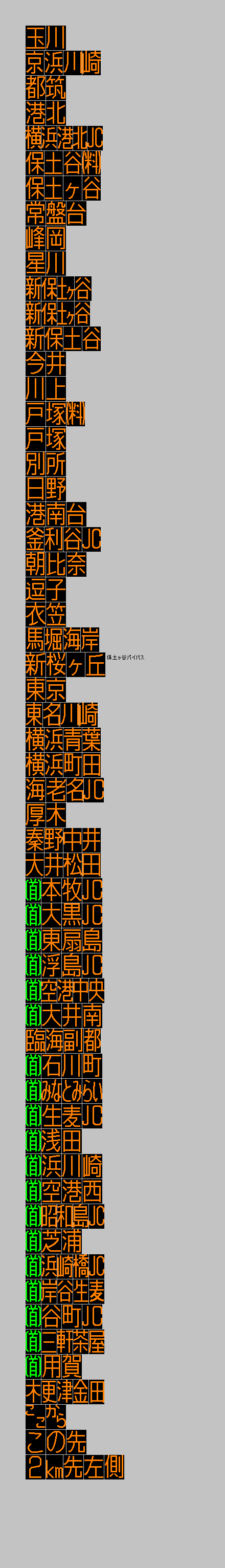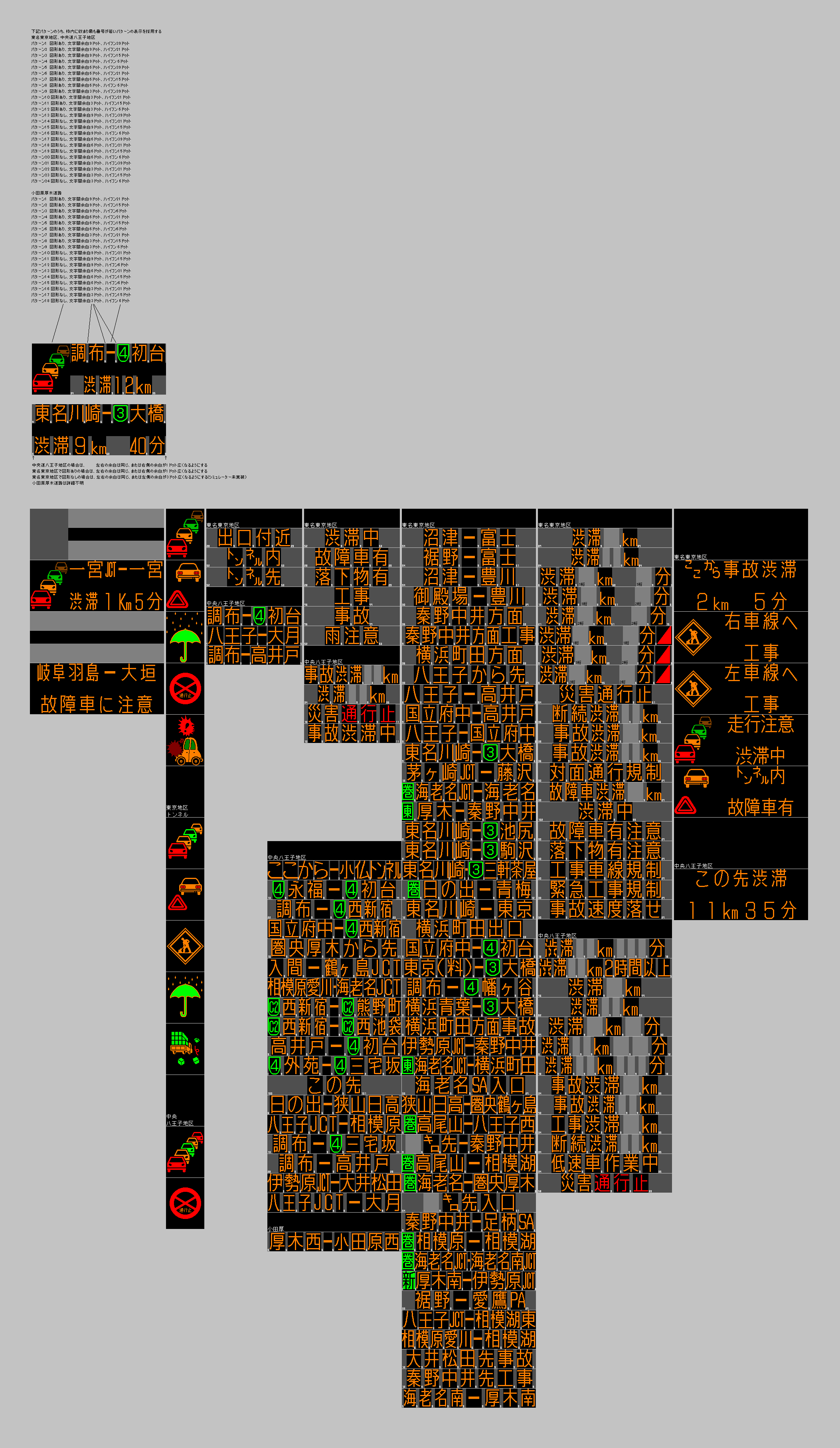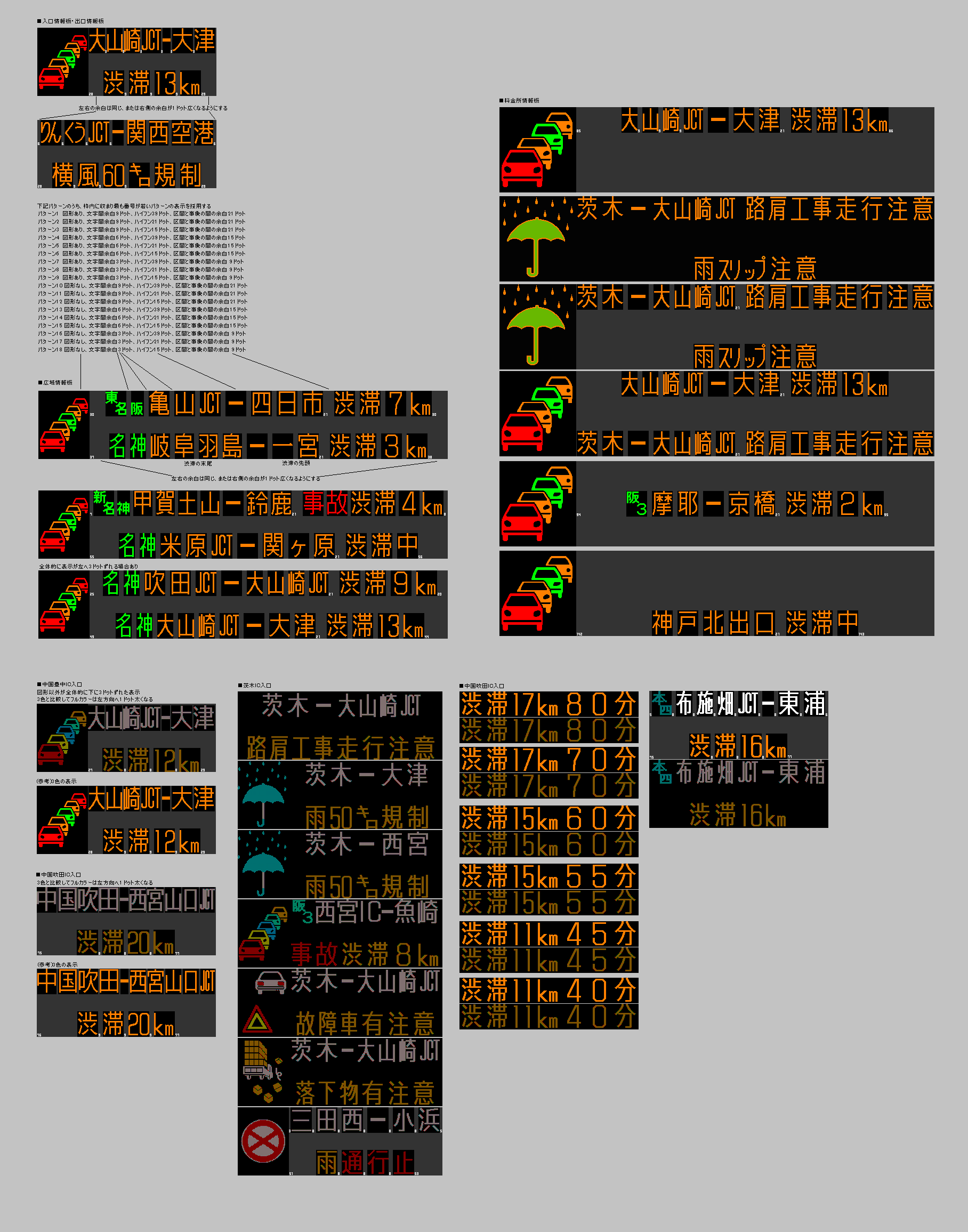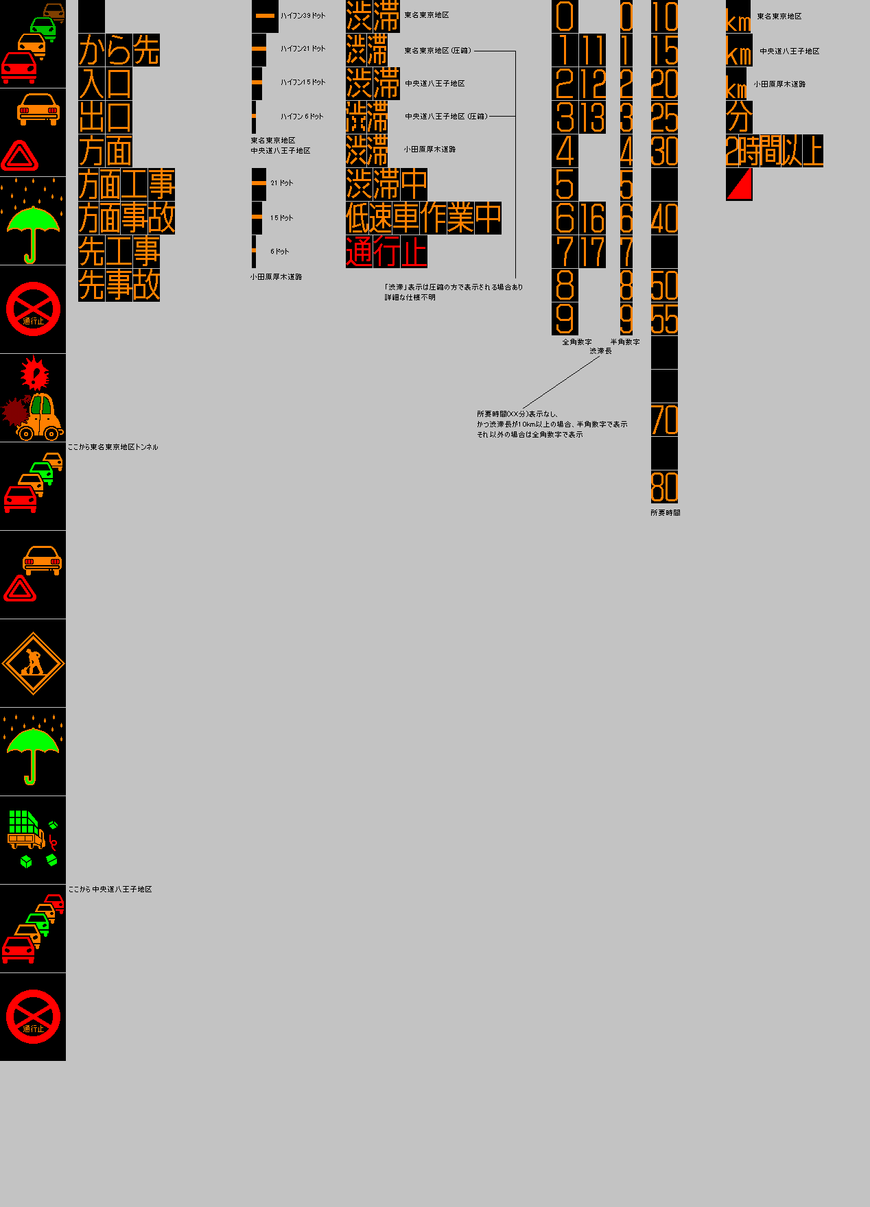 フリー入力で表示される文字は、NEXCO西日本関西支社や阪神高速3色で集めたものを元にして、フルカラー用の表示は一括変換で作成しています。