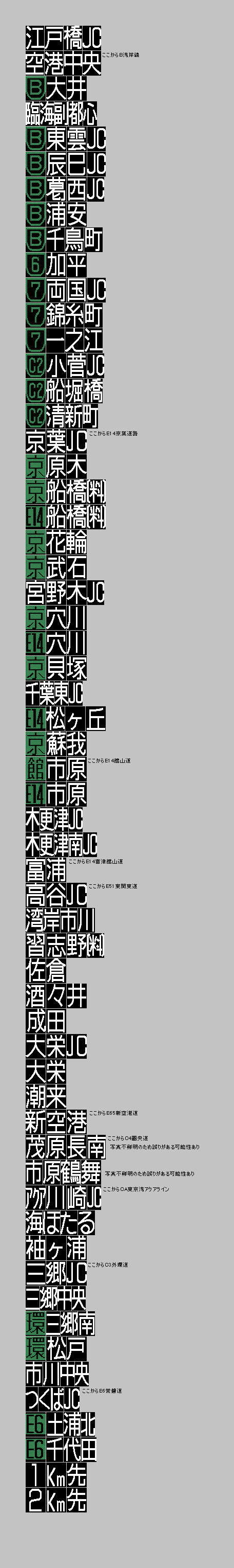 2025/8/30 NEXCO東日本 関東支社 外環道 フルカラー版に約50種類の地名表示を追加。⇔の横幅が状況に応じて変わる仕様に対応。▲ありの場合に渋滞長の右側の余白が誤って表示される不具合を修正。
